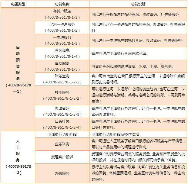 客戶只需撥打電話號(hào)碼 40078-96178 , 或添加企業(yè)QQ客服號(hào)碼 4007896178 ,即可24小時(shí)、全方位的享受營(yíng)口銀行為您提供的各種電話服務(wù)。