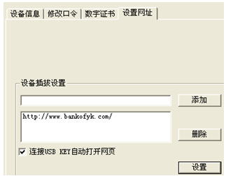 ②原因是沒有勾選自動打開網(wǎng)頁。雙擊小黃鎖或者是我行EK圖標——設置網(wǎng)址,進入下圖畫面,將我行網(wǎng)址www.rencaitongliao.com添加入列表,勾選“連接USB KEY自動打開網(wǎng)頁” ,且點擊設置。